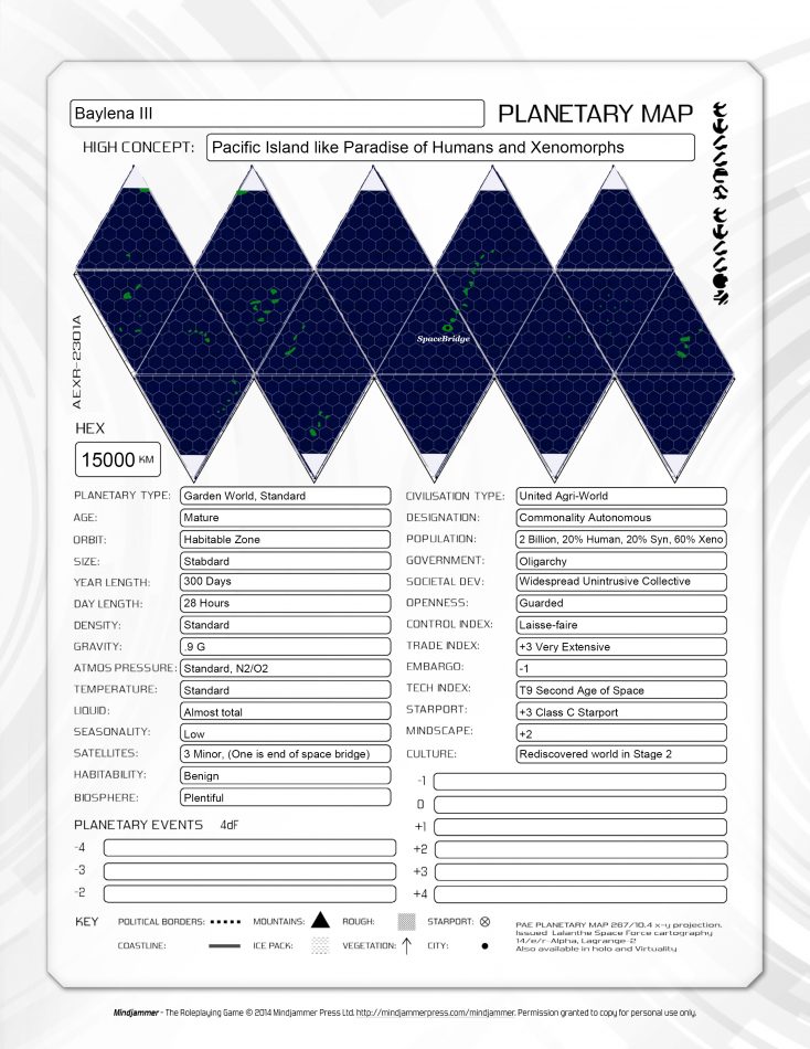 Baylena III is a standard garden world settled 7303 years ago by settlers looking to explore aquatic xenomorphs free of the sanctions of the Home worlds. The world was heavily terraformed while most of the colonists remained in stasis. While the original colonists were human and smaller cetaceans, the crew were gengurnic specialists as well as experts in planetary engineering. Not only was the world changed, but new forms of sapient cetaceans and cephalopods. All three moons were moved into orbit, one to be the space end of a spacebridge anchored on the sea floor.
