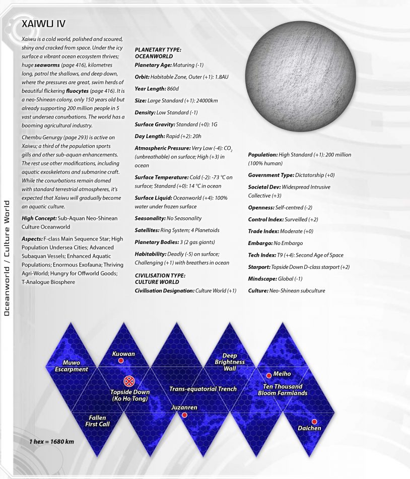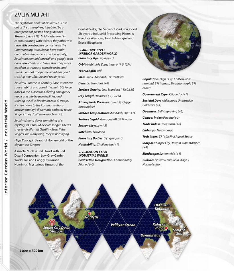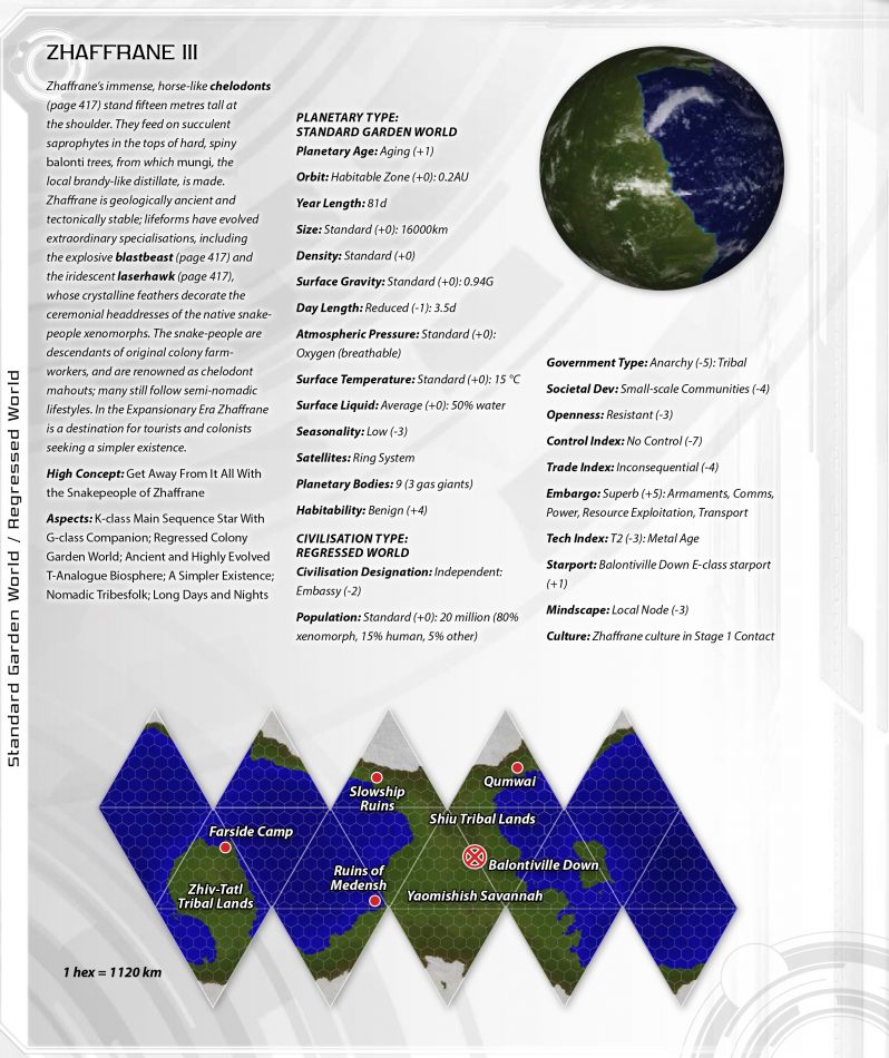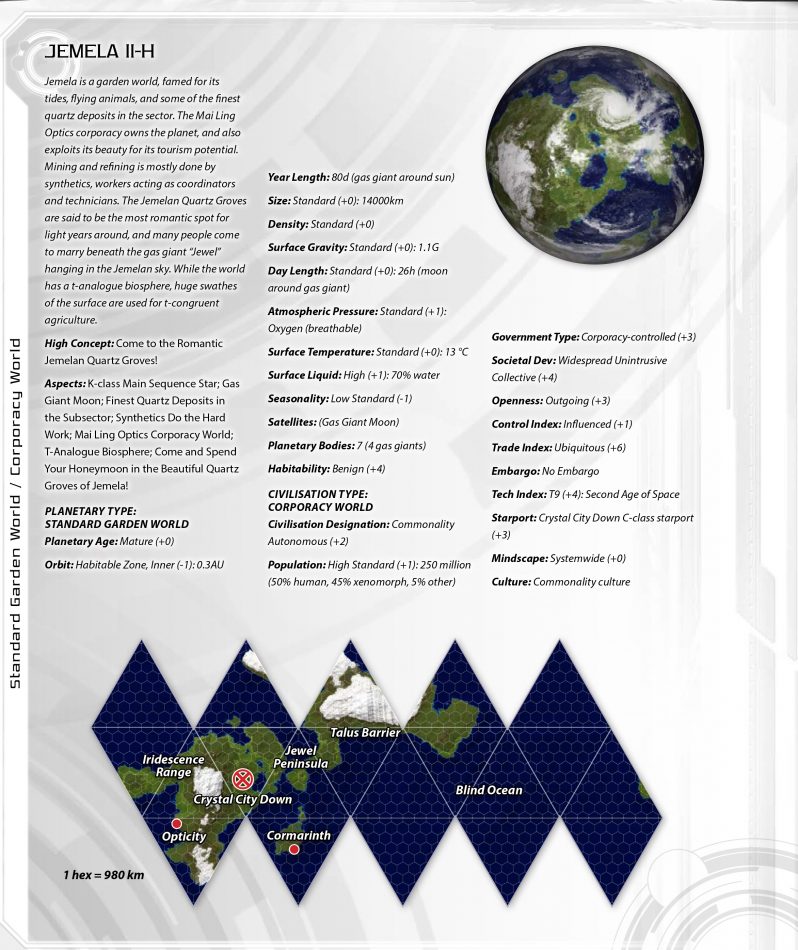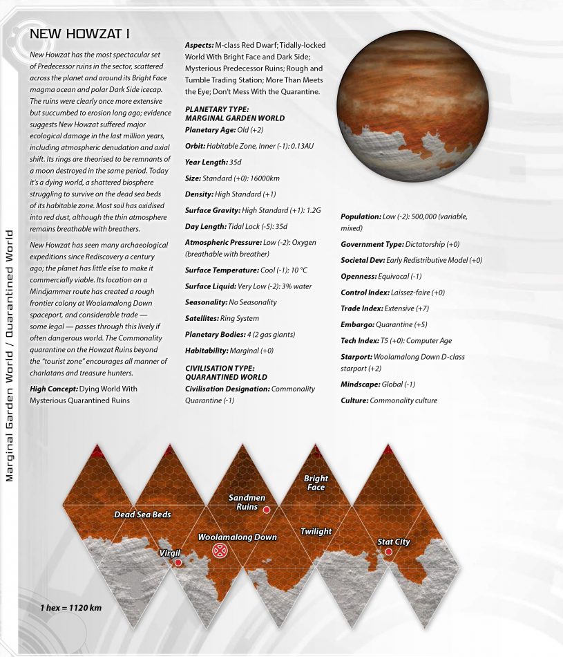 Like all Commonality Space, the Darradine Rim has been opened up in the last two centuries. It contains numerous rediscovered worlds, populated by humans during the First Age of Space; several hominid and xenomorph species; and significant alien presences at Drefnia and Zvukimu. The octant capital at Ajeux is also the subsector capital, and is some 250 light years from the sector capital of Tsentair.