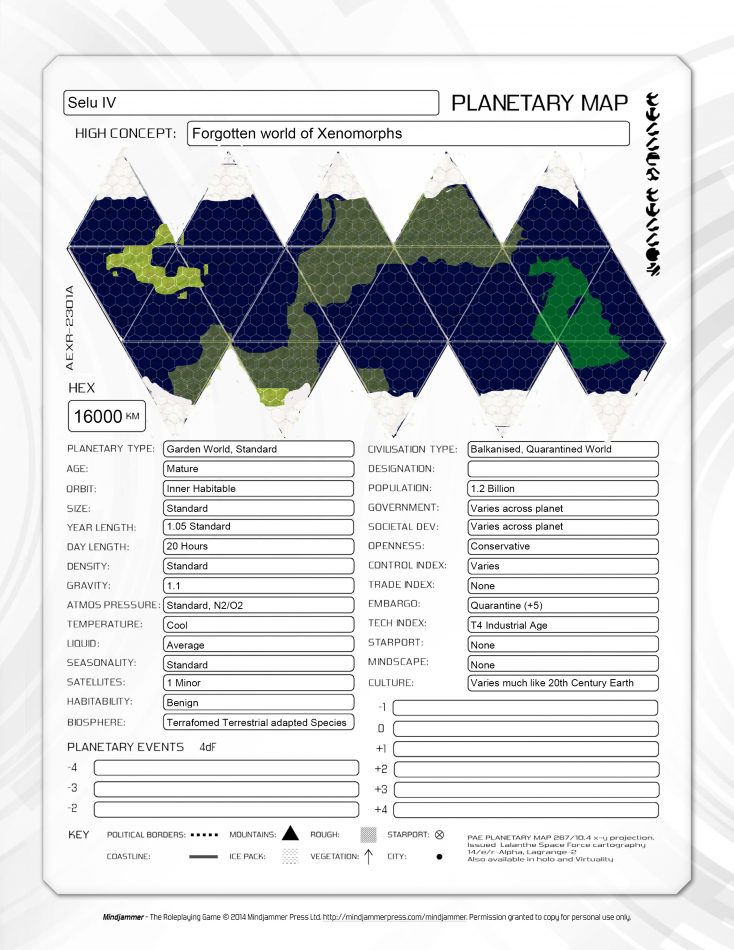 Selu IV is a Standard Garden world within the Darradine Rim. It was recently discovered (10 years ago) orbiting an G type star well “below” the main ecliptic of the disk. It appears to have been occupied for over 2000 years, but there is little from the first colonists as they appear to have sought a primitive lifestyle.