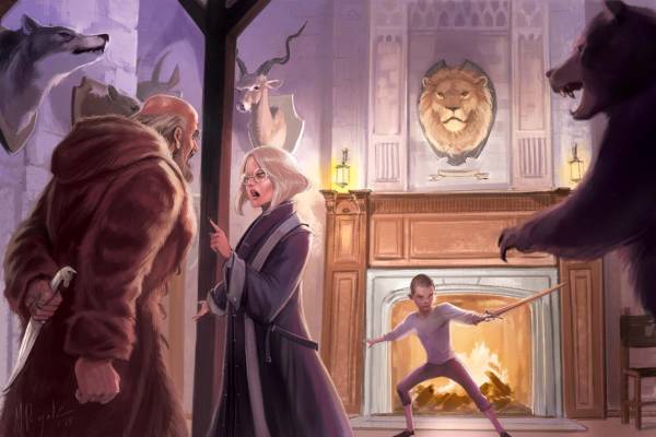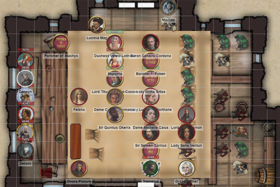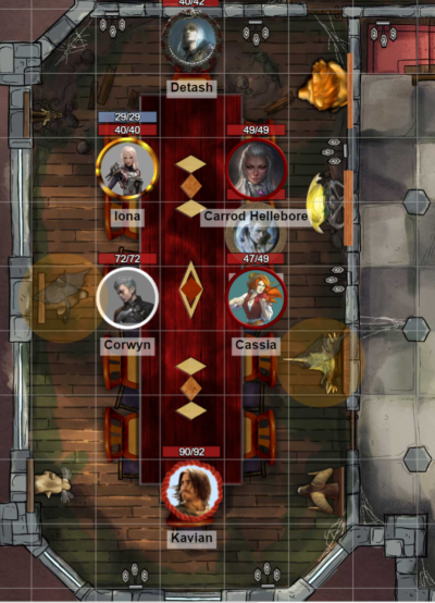 After the young Stavian upsets the bride, Mikhael gets him upset in turn, getting him to leave, while Kavian calms the groom. This sets up the secret cultist, Stavian to return later in the night, with a band of cultist. As the cultists come in through the windows, Mikhael says his mother’s name three times. As the room falls into chaos, the party and Kathan Zalar move to intercept the foes. Lady Meristiel Elluvidnir steps into the room in a cone of light emitted from Mikhael’s broach, along with two Elven warriors. The cultists are no match for Kavian, who begins to cut through them. Zalar fights a defensive action, taking hits, but blocking cultists. Mikhael, having summoned his eidolon, also fights. Elsa, living up to her northern heritage moves towards the biggest numbers while Cassia also moved into place. The Cultists are dangerous and the situation is dire.