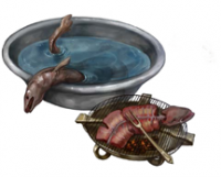 After a few moments, the wolves animate. They rise on clicking mechanisms, their bodies straining to stand on two legs. During this movement, however, one of the wolves’ hind legs collapses, while the fur on the other wolf ’s back splits open, rendering them both inert. Following this horrific display, the griffon’s wings begin to beat, only for one wing to tear off entirely. Moments later, it rips off the front foot attaching it to its display and moves to attack any living creatures in the chamber, as a spark of insight pushes it to inflict pain on others.
