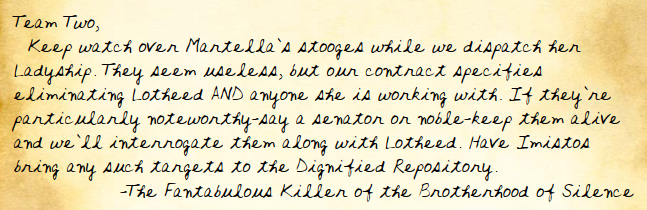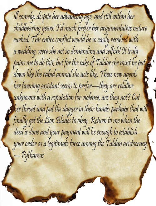Cassia and Corwyn engage noble families throughout Taldor. At parties and gatherings using a combination of logic, appeal to patriotism, bribes, and sometimes, outright threats, they sway many Senators. Cassia in particular uses her old friends in the Lion Blades to uncover secrets that might help sway difficult opponents. For his part, Corwyn begins looking for clues to the location of the Brotherhood of Silence.