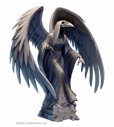 At the end is a chapel, clearly to Aroden, the dead god, as his winged eye symbol is clearly above the door. Inside they are confronted with Three rows of pews stand before a stone altar. A human statue stands atop the altar, its face and right arm broken off and shattered at the floor around it. Two smaller statues of women—each wielding a sword and shield—stand in raised alcoves in the southeast and southwest corners. Clearly, they are the heralds of Aroden, Arazni and Iomedae.