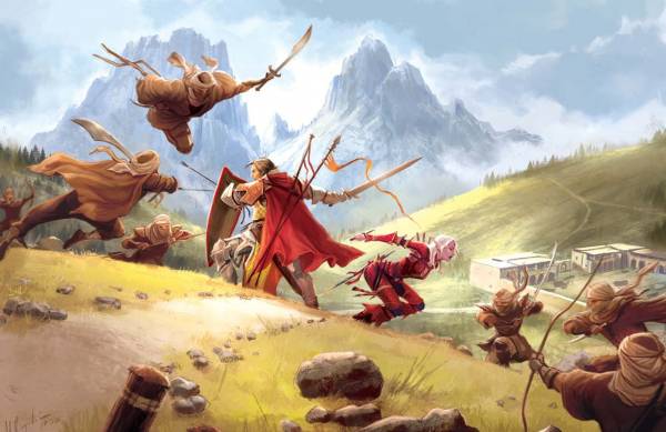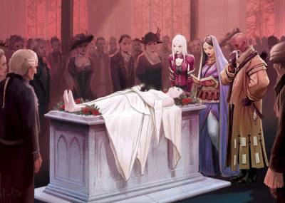 “But unlike you, Lord Kalbio, these Taldans—my children, truly—are not grateful. They scheme and plot, dream of hanging their dutiful father and placing a woman—a woman, sir!—on the Lion Throne! And they have seen fit this very day to induct you into their conspiratorial ranks. And that is why here, now, you, Lord Kalbio, will be the first among them to die.”And with that, the Emperor of Taldor takes out a jeweled dagger. Both Corwyn and Kavian leap forward, vaulting over the guards and stunned guests. Kavian was more accurate in his aim, and as he shoved Kalbio aside, he tackled Grand Prince Stavian III. Corwyn landed next to the two, prone. The Ulfen guards drew their swords and brought them down. They missed Kavian, for fear of hitting their liege. Tremerus, who also had moved forward, hit the entire area with a flare, blinding everyone in a flash, but it was too late for Corwyn. A great blow fell against his neck to decapitate him in one blow as the spell went off.