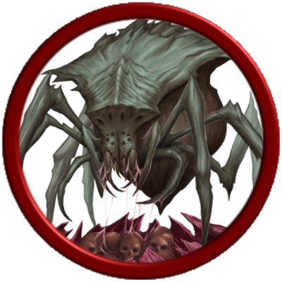 A wrought iron framework supporting thick glass panels creates an imposing dome, though sediment from the dirty harbor above blocks most of the light that might otherwise stream into this underwater chamber. From the apex of the dome hangs a gigantic fossilized spider, which swings from a thick rope of roughly woven, silver silk. The cult’s main temple is this underwater chamber, built decades ago at great expense by a Gozreh-worshiping member of the Caligaro family. The presbytery shows signs of age: puddles of leaking seawater form on its tessellated floor, and its glass panels are clouded between webs of rusted framework. The chamber looks like a refugee camp for cultists as much as a place of worship. The petrified idol itself dominates the chamber, hanging suspended and upside down above the water-damaged pews and makeshift cots of the assembled cultists. Similarly suspended are three sacrifices: webbed cocoons of drugged and paralyzed victims prepared in area and moved here, where the idol/would be god, Mog-Lathar consumes their dreaming minds.