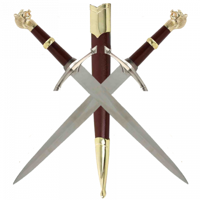+1 Enchanted Cold Iron Paired Blades. Each has a brass sheath and lion’s head on the handle.