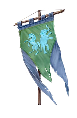 This meticulously woven flag depicts a horse and an elephant, both about to charge. The tapestry’s green and blue colors underscore the beasts’ connection to Taldor’s distinguished cavalry, the Taldan Horse, in which they have long been the most commonly used mounts. Though this particular piece of heraldry is rather rare in all reaches of the empire, those who know their Taldan military history know that this banner’s design has been used for hundreds of years.
