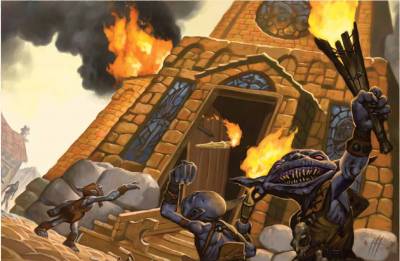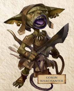 Goblins are attacking the city! When the goblins attack, they shriek and leap and race and cackle, taking great joy in the panic and fear they spread among the humans (whom most goblins insultingly call “longshanks”). Some goblins wave torches and light tents on fire, while others chase children and pets with ill intent. The entire time, goblin warchanters sing a horrifically catchy and nerve wracking goblin song at the top of their lungs, further spurring their kin into murderous frenzy. Everywhere the heroes, goblins tear through merchant stalls, menace locals with their dogslicers, throw rocks through windows, and otherwise make terrors of themselves.