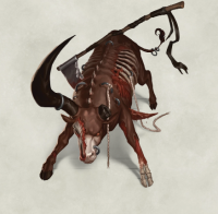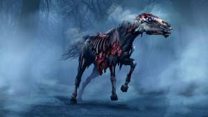 The group does not get much chance to puzzle over this as they hear a distorted whinny of a horse and turn to see a zombie horse and two zombie hounds approaching. Blake runs forward and block the horse from moving forward between two wagons. The hounds leap over. Blake and the horse fight it out, with the zombie striking him badly. The hounds leap forward, one on Tsekani and one against Blake. Finding the skeleton has no meat, it moves forward. Sebastian uses his short bow while Zaheri fires his crossbow. Tsekani takes traditionally monk approach and beats the hound with his fists. Sebastian uses his battle medicine on the monk, while Zaheri keeps firing at the foes while Blake is forced to step back. Sebastian moves to heal him with oil of unlife, and the last of the creatures fall. The group wonders at what is going on.