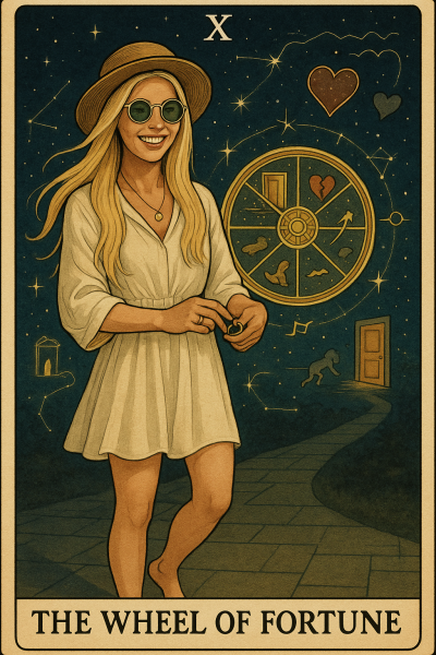 X – The Wheel of Fortune: And there she is. Bell, unmistakable. Wide-brimmed hat, spinner ring in hand, standing barefoot beneath the stars. Her path curves away into the unknown, surrounded by symbols—love, grief, play, fate. Every thread leads outward from her center. Bell stares for a long moment.