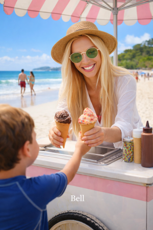 Midday, he sees Bell’s work in action. Kids with dripping cones, parents laughing, tourists letting themselves be silly on purpose. Sweetwater Creamery carts like tiny miracles. People on the beach holding sundaes like they’re holding proof that the world can still be kind.