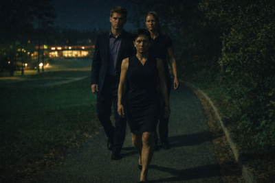 They walk into Jessie’s suite. Weilin and Bell take the sides of the couch, while Josh and Sam grab chairs. Jessie is standing at the window, drink in hand.