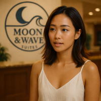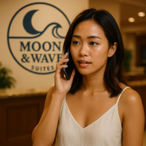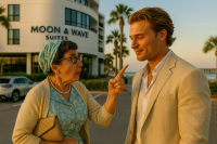 Josh spots the man approaching across the breezeway of the Moon and Wave Suites. Late afternoon sun glints off the polished windows and white railings, casting long shadows toward the lot.