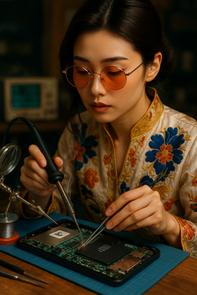 She had started with triage under the microscope: scorched PMIC lifted, rails mapped, and a hairline fracture under the USB-C port wicked full of silver epoxy. She reballed the storage chip, reflowed two buck converters that read noisy on the scope, and replaced a row of singed TVS diodes so a future surge would die there instead of in the core. The new backplate she 3D-printed in PETG carries a thin copper mesh—her Faraday “veil”—and a screw-in cradle for a coin cell to keep the RTC stable when the main pack is off. Between reflows, she sketched a fresh board trace on mylar, then translated it into a razor-clean flex patch to bridge a delaminated zone by the haptic motor. Every fix got logged, voltage-stepped, and heat-cycled until the oscillations stopped looking like a heartbeat and started looking like power. The minutes flowed into hours and hours into days of work in Makergod.