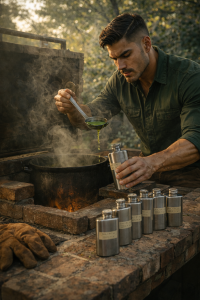 The rest of his attention turns toward smaller works with just as much care. Sam brews practical potions in careful batches, using herbs, resins, and mineral tinctures measured with a ranger’s field sense and a Verbena’s respect for living things. Nothing about it feels theatrical. It is workmanlike, almost understated, until the scent of crushed leaves, alcohol, and something sharper begins to fill the room. When each mixture is ready, he pours it into sturdy metal flasks instead of glass…durable, portable, meant to survive hard use and bad conditions. He lines them up once they are sealed, labeled in his own efficient way, each one another quiet preparation for whatever comes next. Between the shaping of the staves and the filling of the flasks, his days take on a rhythm of readiness…the kind built not on anxiety, but on the deep belief that skill, patience, and preparation are their own form of protection.