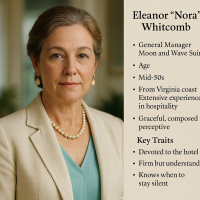 Background: Born and raised in a historic coastal town on the Eastern Shore of Virginia, Nora grew up surrounded by salt air, sailboats, and old Southern values. She managed high-end inns in the Carolinas before being recruited by the ownership team behind Moon and Wave for her reputation: unflappable, elegant, and fiercely competent.