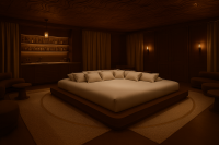 Salt-clean air with a thread of citrus and cedar. Amber pools of light from shaded sconces and lanterns. Underfoot, wide planks of oiled hardwood carry a circular brass inlay—the Wheel—now set as a halo around the centerpiece of the room: a broad, low platform bed.