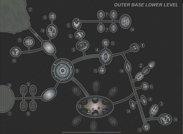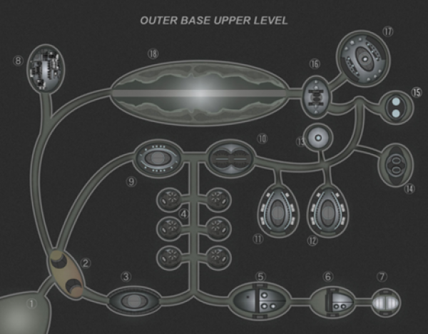 The outer base is located more or less at the same level as the ground surrounding the mountain. This is the only part of the installation that can be reached from the outside, either by way of the intended entry points or fissures in the mountainside. Six long tunnels radiate out from the outer base, leading to concealed landing areas.