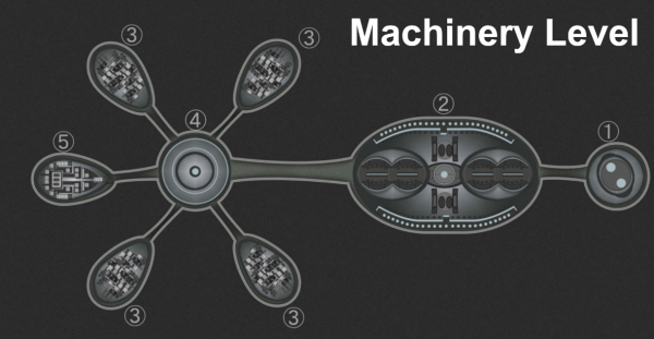 These chambers contain complex and mysterious equipment, some of which seem to be connected with the operation of the base. There are few distinct systems; power, water and air-related equipment is intermixed in the same blocks and compartmentalized to deal with damage or breakdown. Around the walls of the chambers are workstations, which presumably can be used to manually alter conditions in the base.