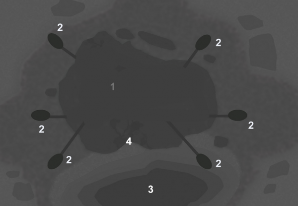 Six concealed landing areas lie at the end of long tunnels radiating out from the central base. They are sunk into the bedrock and covered by a set of retractable doors which perfectly match the surrounding terrain.