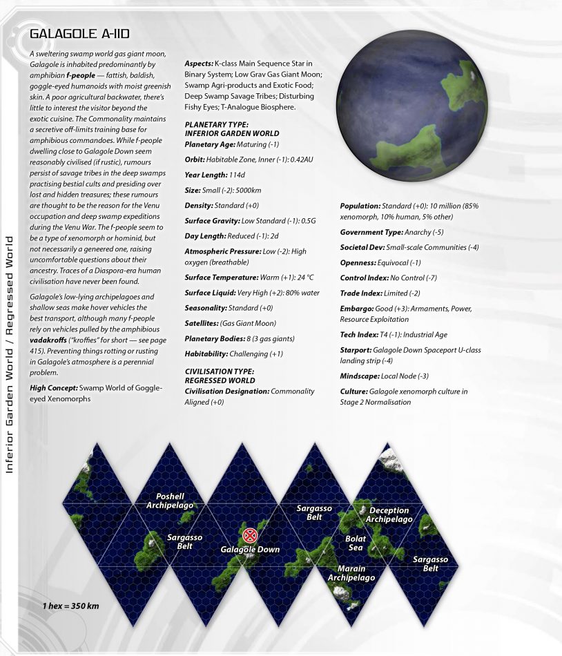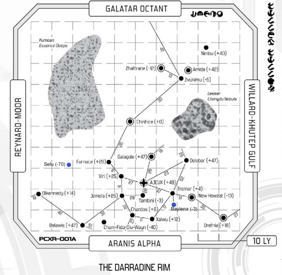 Like all Commonality Space, the Darradine Rim has been opened up in the last two centuries. It contains numerous rediscovered worlds, populated by humans during the First Age of Space; several hominid and xenomorph species; and significant alien presences at Drefnia and Zvukimu. The octant capital at Ajeux is also the subsector capital, and is some 250 light years from the sector capital of Tsentair.