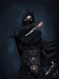 Black Cloaked, Black Masked, with Black Makeup around the Eyes, and Covered Arms, with a threating demeanor