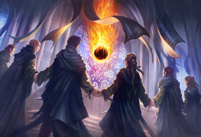 The group decides to disguise themselves in the manner of the of initiates, and each uses his or her hat of disguise to do so. Pale under olive green robes, the group heads forward and are met by 4 deacons. They easily bluff them as initiates and one deacon leads them towards the ritual site. They head downstairs into a gallery.