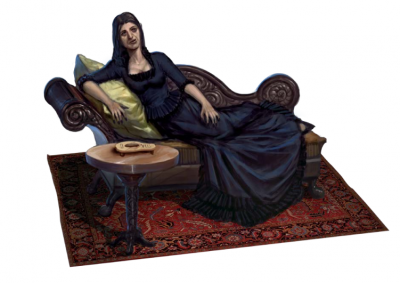 Madame Carrington suffers from a degenerative muscle disease that has left her almost entirely paralyzed and nearly incapable of speech. Her severely atrophied body is attired in a black mourning dress several decades out of fashion and her face is frozen in a grim rictus. Her eyes, however, reveal an active mind full of smoldering dignity. She can communicate through the following means: using mage hand to control a nearby planchette or talking board to produce messages.