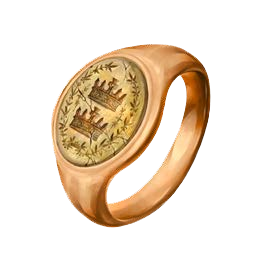 This golden ring appears pristine on the outside, but the inside shows centuries of wear, leaving the inner band perpetually polished to a lighter hue than that of the ring’s outer surfaces. The family crest adorns the front, depicting olive branches encircling two crowns, seemingly indicating a house dedicated to ambassadorship and diplomacy. This is the now extinct Legatus family, famed ambassadors over 300 years ago, until the family was attacked and killed by the Stavian Family.