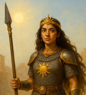 Breathing heavily, the group discussed going into the city to protect the citizens. The spy a Kelishite woman running towards them. She is dressed in chainmail adorned with a shining sun. She carries a spear in one hand while she is trying to take a flask from her bag. Unfortunately, it leaps from her hands, flying towards Ina. She tries to grab it, but at the last moment is changes directions as if batted away. The strange woman snatches it off the ground and says ”Thanks”. As she drinks it, the wounds on her body close and fade. It is a healing potion.