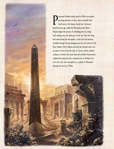 Unlike many of Osirion's tombs and graveyards, however, the Necropolis of Wati has remained largely untouched, in no small part because of local taboos and the protection of the Grand Mausoleum's priests. But Khemet III has now ordered the local authorities and church of Pharasma to open Wati's necropolis to exploration for the purpose of discovery, study, and economic stimulus.