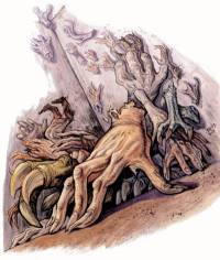 North of the Hall of Protection, the ceiling rises to a high dome 40 feet above the main floor, forming the primary cathedral of Nethys. Three flights of short, steep steps climb up to a large platform elevated 5 feet above the floor. At the rear ofthis platform, a 15-foot-tall statue of Nethys, half white and half black, stands atop a raised octagonal dais. The top ofthe main platform is tiled in black marble while the octagonal dais is a striking white, and the ring that separates them is tiled in red. hiding behind the large statue of Nethys at the far northern end of the room is Shargah-Katun an Aghash Div. This foul outsider reveals itself and opens with a cursed gaze from its single eye. Everyone but Tumani is in its effect, but only Ina is caught in its gaze. She is confused but able to act normally. Keva and Kepher attack, with Kepher using his smite power. Shargah-Katun is stunned by the ferocity and damage of the attack and uses its dimension door ability to vanish.