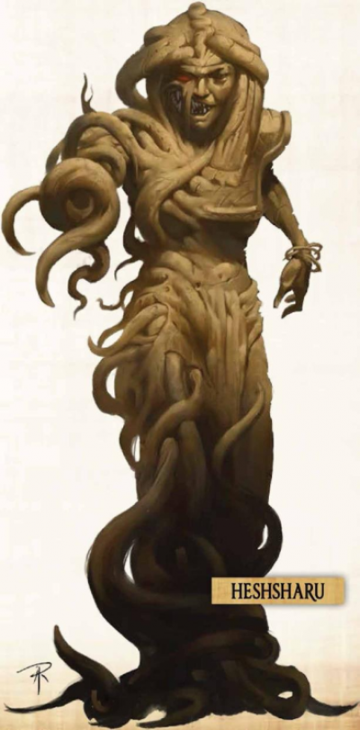 Shargah-Katun is arrogant. His primary foe cannot hit him at all. He concentrates his claws on Keva, the self-blinded man in front of him, and his gaze goes from stunning to deadly. The women stand behind him to attack, with Keva in front, but the creature seems to swirl and move, avoiding their damage. Idorri goes down in a vicious attack as Kepher attacks Keva.