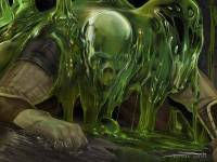 Kepher has heard a scraping along the wall. Suddenly, blocks push forth and a skeleton, cover in ooze bursts through the wall, followed by the ooze that spawned it. This creature appears as a large, undulating mass of green-black goo from which rotted and broken bones protrude. It flows into the room, followed by several more skeletons.