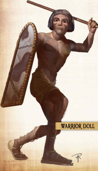 They enter the room to see a brightly painted chariot and small chest. Ina finds a trap but fails to disarm it. Fortunately, her damage is slight and the clear poison on the trap has long dried out. Inside are potions, art, and books. The group is happy for its finds. As they move deeper into the other half of the room. Ubashati warrior dolls leap from a diorama and attack! They manage to defeat the dolls, and again Tumani uses more healing energy to shore up the party. There are five more chests without traps this time. Again they find more ancient items they know they can sell. They also find out that the tomb of Akhentepi’s mistress is also attached. This may mean finding a secret door or two.