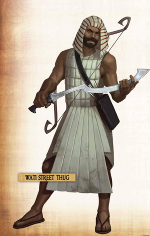 The Canny Jackal hosts many of Wati's richest collectors and historians, from local nobles to representatives from An, Tephu, and even Sothis. Auctions traditionally begin an hour after sunset, with a complimentary reception beforehand for the attendees to mingle with one another and enjoy refreshments. This evening, the Jackal is offering cheese-stuffed figs, hard-boiled peacock eggs, onion bread, onion-stuffed squid, fresh and dried fruit, spiced wine, and a sampling of 2,000-year-old honey recovered from one of the tombs. By the time the Lost Fragments and their guest arrive arrive, several noteworthy members of Wati society have already gathered, and more filter in as the night wears on. Two dozen attendees other eventually arrive besides the Fragments, Including some of the other groups they met previously. Only a handful of the attendees are there to make serious bids. Notable guests include the following: