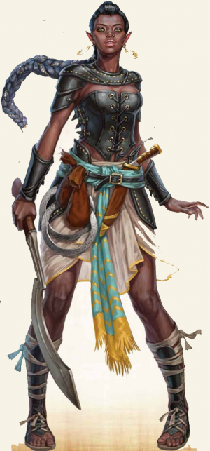 After the assignments, Tumani suggests they see if they can find other teams to visit with. They end up going to the Tooth and Hooka Inn. They run into two groups, the Dog Soldiers, who are composed entirely of halflings and their back of trained dogs. They are wild and boisterous and the party steers clear of them. Of more interest are the Daughters of the Desert, an all-female adventuring party. Both Keva and Ina head over interested in information and perhaps romance. Keva does most of the talking. The women are led by a Ulfen woman, Sigrun, and is composed of a Rahadoumi and two twin sisters wearing veils. Sigrun is keep to document the history that Keva gives her and the Daughters learn more about him than the other way around. The depart with a promise of dinner the next night after both parties have entered into and exited the city.
