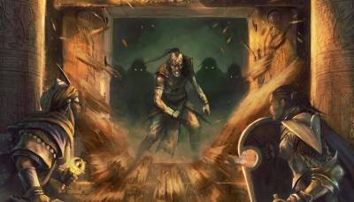 Looking at the outside, it appears someone in the past had maybe tried entry. After taking some time to shovel the sand away, they struggle to open the doors with crowbars. Finally it is opened and they leave the doors ajar to let light enter. Inside, they find the Antechamber. There is stale air and a layer of dust and stand in the floor. Stone faces of Pharasma and Anubis. There is also a warning in ancient hieroglyphs about robbers and curses.