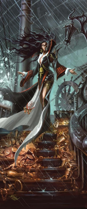 Besmara is a thorn in the side of many lawful powers and a casual ally or enemy of just about everyone else. Like her followers, she interacts peacefully when it suits her, but may betray an ally when it is convenient or profitable. She has been known to associate with Cayden Cailean (who considers her dangerously attractive), Gorum (who treats her like an untrustworthy mercenary captain), and Gozreh (who calls her sister, lover, monster-tamer, or all of the above). Erastilloathes Besmara because she is a threat to families and doesn’t adhere to his idea of a woman’s role, Iomedae dislikes her because the Pirate Queen has a corrupt sense of honor, Abadar abhors her because she is a disruption to naval trade, and Asmodeus despises her because she has no sense of order, dares interfere with his plans, and is a female who disrespects him. Because her home is in the Maelstrom, she has frequent interactions with protean cabals and their mysterious lords, but has bargained and bribed them into accepting her presence.