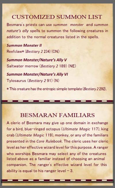 Besmara is the patron of sea monsters, and all of her best-known minions are great beasts from beneath the waves. All Besmaran priests know of dead pirate captains who are legendary in their hometowns and may call them with the right bribe, but most prefer to conjure nightmare creatures to drag enemy sailors to their deaths. Her herald is Kelpie’s Wrath, a haunted ship that is a living being (see page 86). The following are well-known supernatural servitors of Besmara, suitable for conjuring with planar ally or similar spells.