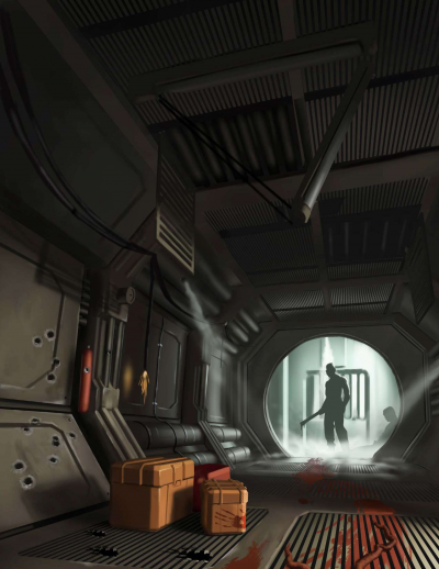 The pirates charge out to support their comrade. Over the radio their leader, Ruce orders his men to sign in, even as two of them go after Lucas and start a stunner fight. Before the two men in the aft hallway can respond, Maria has padded up one in her stockinged feet and dropped one with a stun, falling to the floor with his body as cover. The man in front of him turns and sees Sorrel in the elevator and charges, vaulting his friend, only to be shot in the crotch by Maria. She motions Sorrel up as she gets up and moves forward to the bend in the hallway.