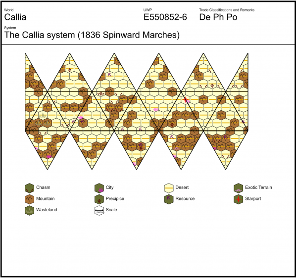 Heading east is fairly easy at first. The lakeshore curves away to the north after a while, and the ground rises. steadily. Bushes and trees dot the landscape, becoming thick in places. After a couple of kilometres, it becomes apparent that reaching the antenna site is going to take a lot longer than expected as the Travellers detour around a few areas of thick, spiny vegetation. The going is especially hard for those used to a climate-controlled environment with flat and nicely carpeted corridors.