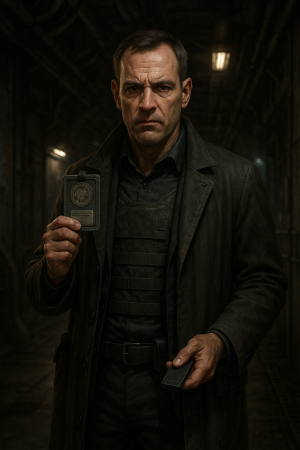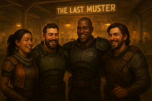The men enter at different times. The place hums with low laughter and sharp edges. At one table, two men in patched flak vests slam their fists in rhythm, daring the other to keep drinking; casings clatter in the ashtray with every glass set down. A woman with a buzzcut and a half-burned throat sips something the color of coolant. Another pair lean close in a booth, muttering about a job that smells like a setup, but the pay’s better than starving.