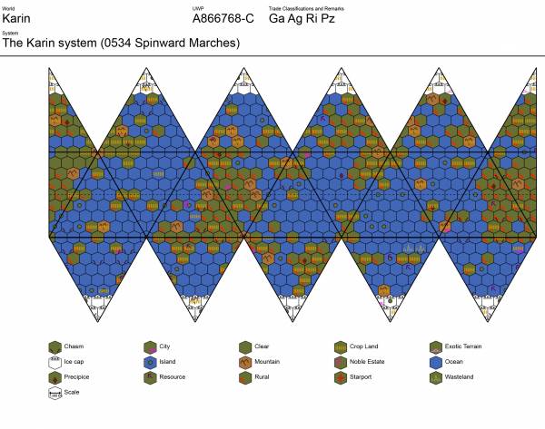 Karin is a large, rich, garden world as close to the middle of the Five Sisters as is possible. It has large oceans covering two thirds of its surface, with all of the climate zones one expects from an Earth-like planet. It was a perfect world for settlement.
