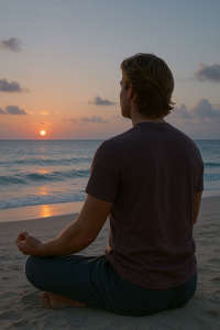 She sits by the balcony door: crown light at bǎihuì, tongue to palate, hands over the lower dāntián. Breath drops into gentle tǔ-nà—in to the belly, out a touch longer—attention returning to dāntián with shǒu yī, guarding the One. Weilin’s Etherite layer hums below the posture: dāntián as regulator, breath as carrier wave, attention phasing to a steady lock.
