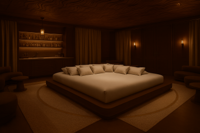 The sanctum is alive with soft pulse and intention—sensual textures, layered scents, the subtle thrum of low-frequency rhythms and sacred geometry embedded in the very architecture. It amplifies everything. Bell does not understand it yet, but after three years of ritual, Ecstatic magik is safe her. Bell sits cross-legged on a cushion, the velvet cool under her legs. The weed has focused her and settled the noise. Across from her, Mae lounges in a low chair, heels kicked off to the side, slacks still crisp but her blouse collar open. She’s every inch the off-duty professional, posture composed, curiosity piqued.