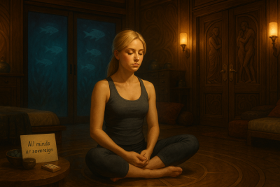 She sits by the balcony door: crown light at bǎihuì, tongue to palate, hands over the lower dāntián. Breath drops into gentle tǔ-nà—in to the belly, out a touch longer—attention returning to dāntián with shǒu yī, guarding the One. Weilin’s Etherite layer hums below the posture: dāntián as regulator, breath as carrier wave, attention phasing to a steady lock.